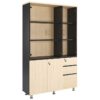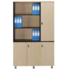 Tủ tài liệu 3 buồng gỗ Melamine, phía trên gồm 3 khoang khung cánh kính để tài liệu, 1 khoang cánh gỗ và 2 đợt di động, phía dưới có 3 cánh mở. Sử dụng tay nắm vát cạnh và có khóa.